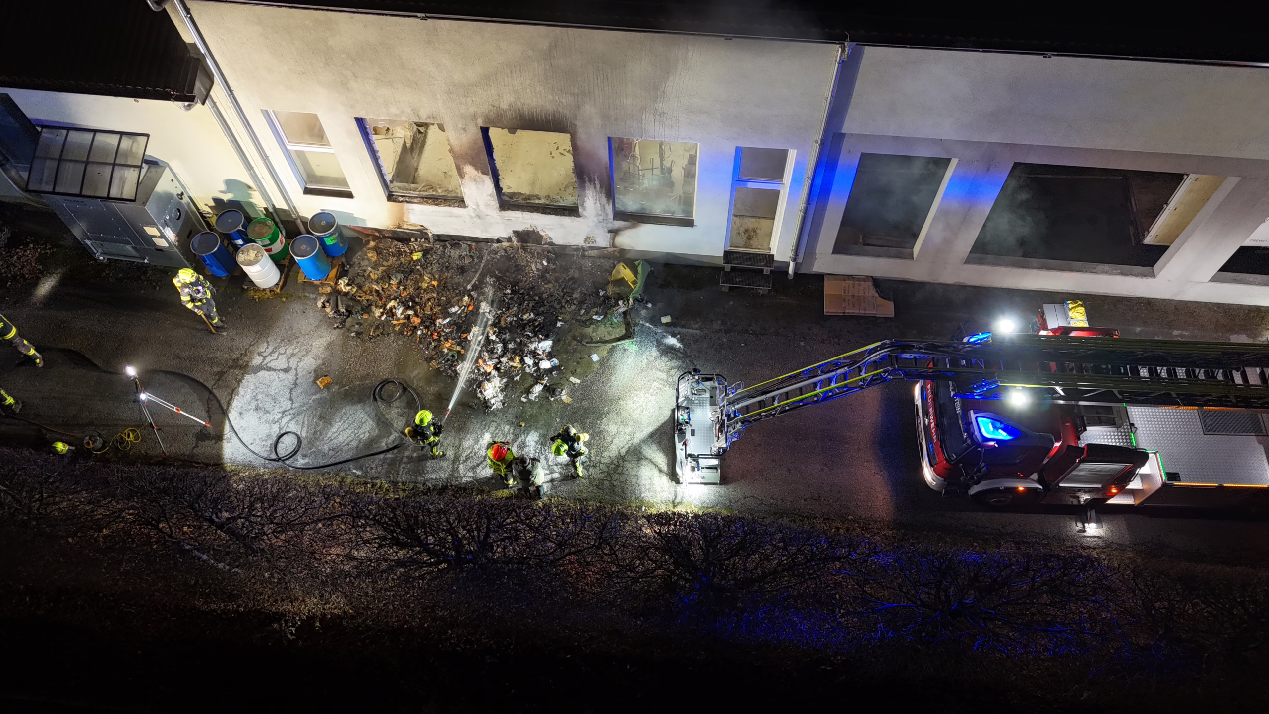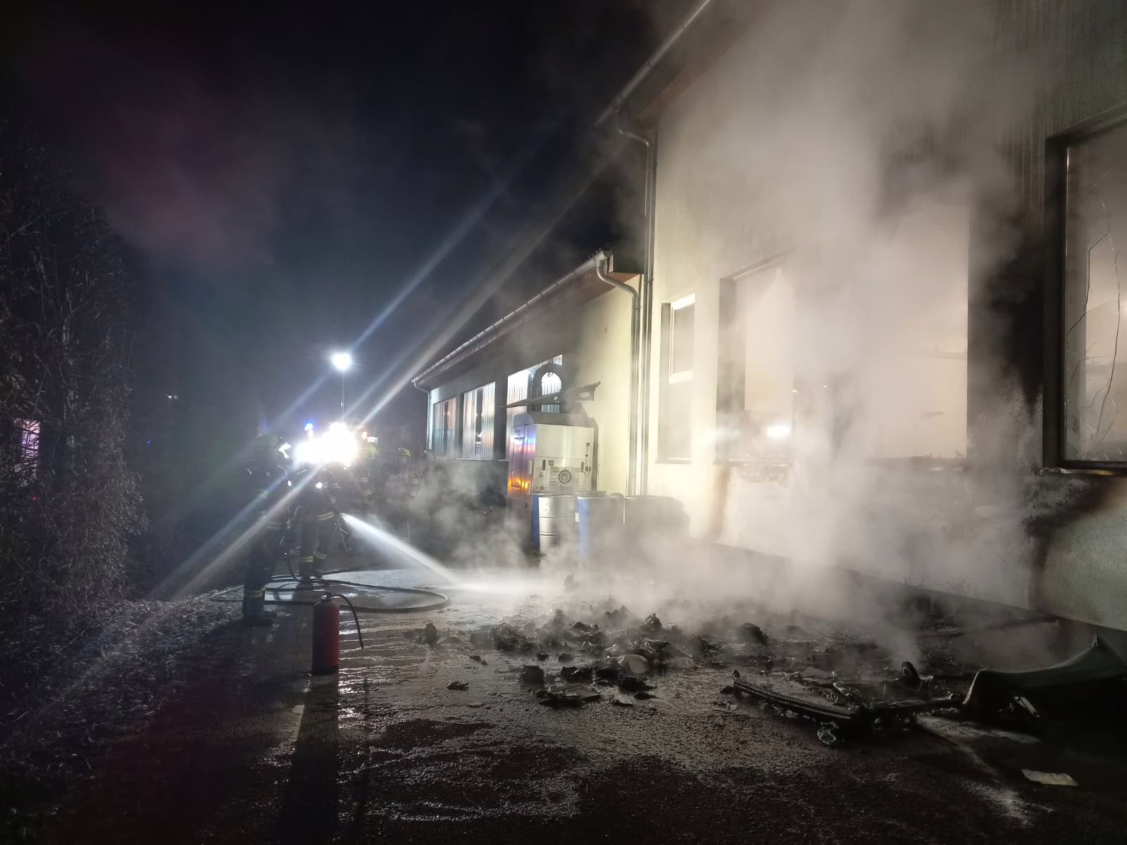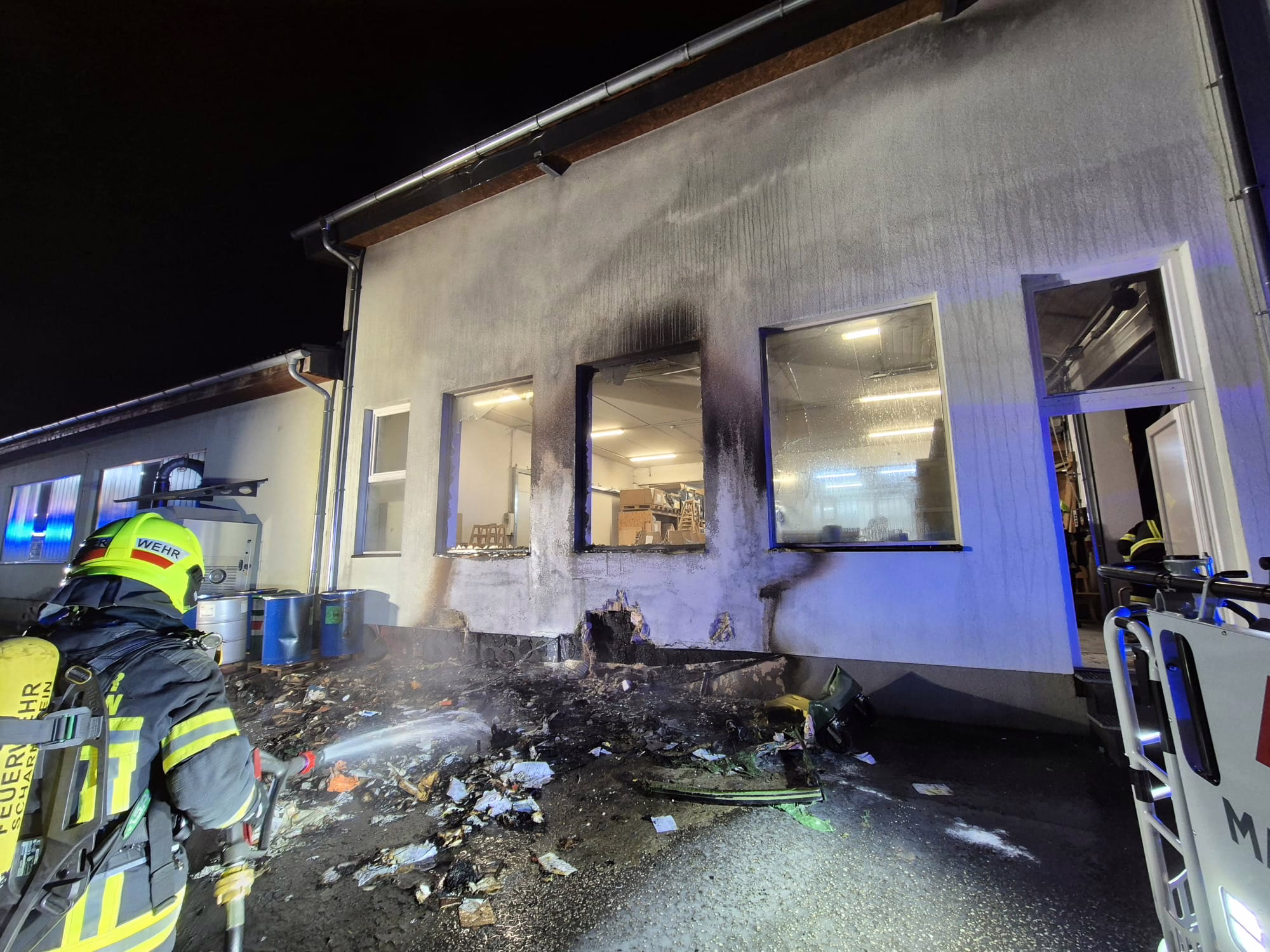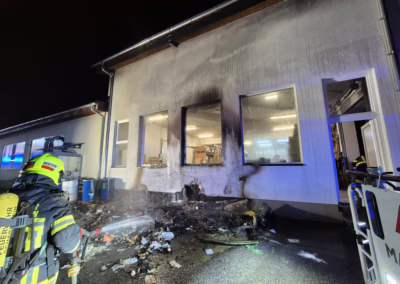 Im Außenbereich eines Tischlereibetriebs war ein Brand ausgebrochen, der rasch auf die Fassade übergriff. Aufgrund der enormen Hitze barsten mehrere Fenster, wodurch das Feuer bereits in das Innere der Produktionshalle eindringen konnte.