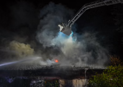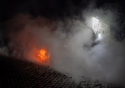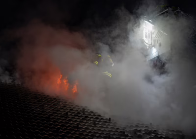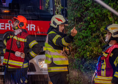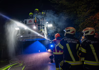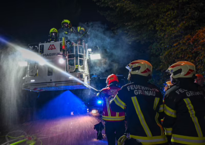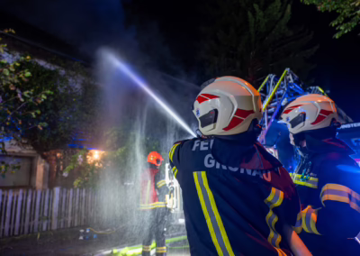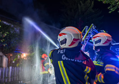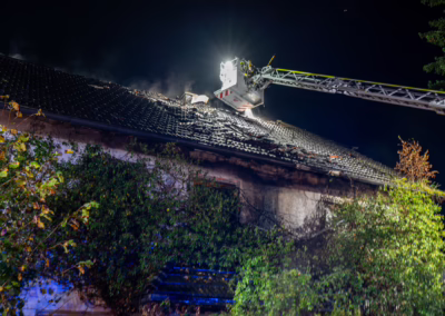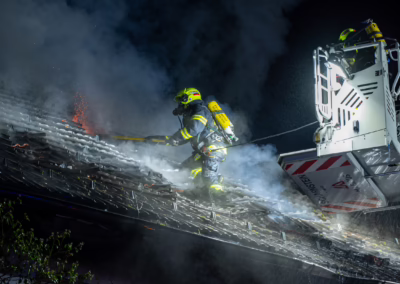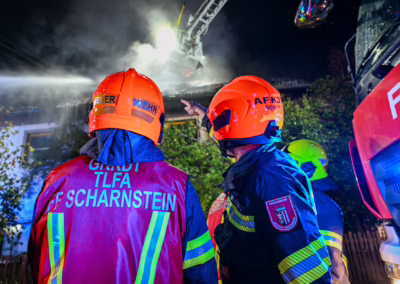Beim Eintreffen der ersten Kräfte hatte das Feuer bereits von der Fassade auf den Dachbereich übergegriffen. Mithilfe der Drehleiter Scharnstein wurde umgehend mit dem Öffnen der Dachhaut begonnen. Unter schwerem Atemschutz und gesichert gegen Absturz konnte ein großer Teil des Daches geöffnet werden, um gezielte Löschmaßnahmen durchzuführen. Dank der Spezialausrüstung der Feuerwehr Scharnstein gelang es, den Brand im Dachbereich rasch und effektiv zu bekämpfen.