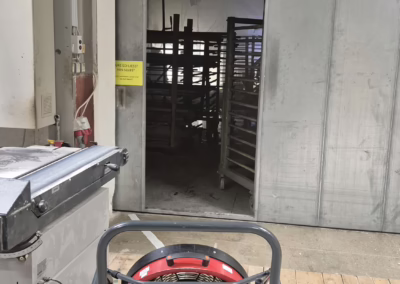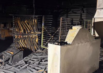 Das Feuer hatte sich bereits über die Absaug- und Lüftungsanlage ausgebreitet. Diese musste teilweise demontiert und sorgfältig auf weitere Glut- und Brandherde kontrolliert werden. Ein Übergreifen der Flammen auf weitere Gebäudeteile konnte erfolgreich verhindert werden.